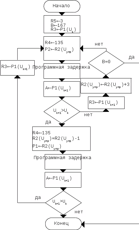 Регистр ОЭВМ R2 будет хранить значения U>упр>, в R3 помещаются значения предыдущего шага U>k>>-1>, а в A (аккумулятор) — значения последующего шага U>k>. В R4 в процессе работы программы будем помещать только N — параметр программной задержки. В B будет храниться количество шагов для прогона всей области настройки. Выбираем N=135, т.к время программной задержки равно 400 мкс, а вся процедура реализуется в 3 цикла, > >.