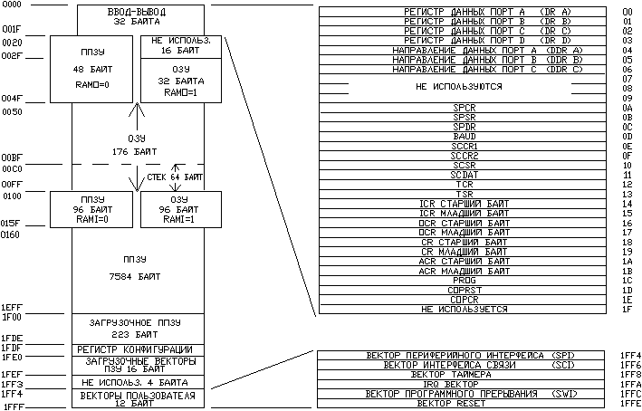 Память ОЭВМ MC68HC705C8 включает в себя от 176 до 304 байт ОЗУ, 240 байт ПЗУ и от 7600 до 7744 байт программируемого ПЗУ. МС68HC705C8 имеет 4 различных типа конфигурации памяти, как показано на рис. 1-2.