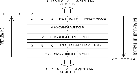 Вход внешнего запроса на прерывание IRQ функционирует в одном из двух режимов. В первом режиме входная логика срабатывает по отрицательному фронту, во втором-по отрицательному фронту и низкому уровню . Во втором случае как отрицательный, так и низкий уровень, подаваемый на IRQ, будут приводить к прерыванию. При возникновении на входе IRQ отрицательного фронта, возникает запрос прерывания. Когда ОЭВМ заканчивает выполнение текущей команды, проверяется наличие запроса прерывания. Если запрос обнаружен и бит маски прерывания (1-ый бит в регистре флагов) сброшен в ноль, то ОЭВМ переходит на процедуру обработки прерывания. Если выбран режим срабатывания входа IRQ по уровню, то этот вывод необходимо соединить через резистор с напряжением питания +5В для обеспечения возможности операции "монтажное или".
