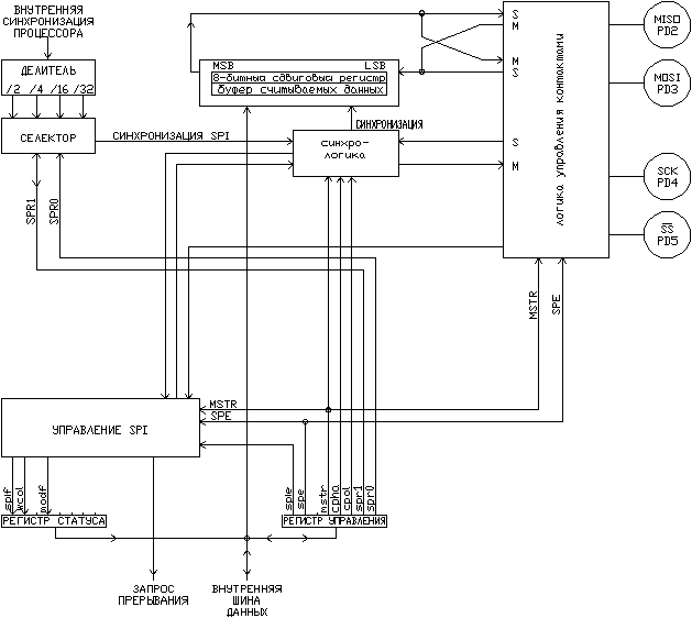 · последовательный периферийный интерфейс блокирован (бит SPE=0). Остальные биты сбрасываются: SPIE, MSTR, SPIF, WCOL, и MODF.