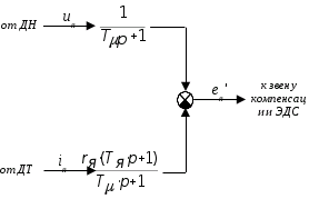 ыразив ЭДС, получим уравнение датчика. Структурная схема датчика тока приведена ниже. Для возможности практической реализации форсирующего звена и защиты системы от помех в сигналах датчиков в канале тока и напряжения датчика ЭДС добавлено инерционное звено с постоянной времени Т>μ>. Таким образом реальный датчик ЭДС будет инерционным.