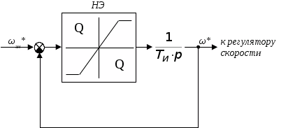 адатчик интенсивности устанавливается на входе САР скорости и предназначен для формирования сигнала задания на скорость. ЗИ ограничивает темп нарастания снижения задания на скорость и тем самым обеспечивает, чтобы ускорение и динамический момент электропривода не превышали допустимых значений. Структурная схема ЗИ представлена на рис. 20.