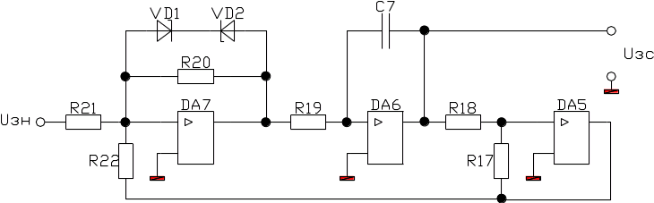 Нелинейный элемент реализуется на операционном усилителе DA7 за счет включения в обратную связь пары стабилитронов VD6 и МВ7. Интегратор реализуется на операционном усилителе DA6. Усилитель DA5 предназначен для инвертирования сигнала.