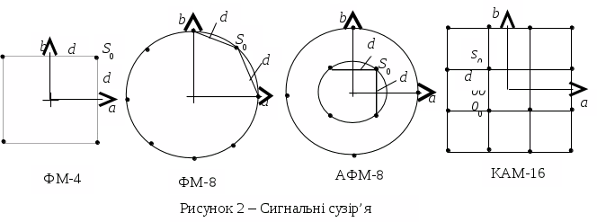 3 Розрахунок сигнального сузір‘я модульованого сигналу. Навести сигнальне сузір‘я для заданого методу цифрової модуляції, розрахувати координати сигнальних точок, навести маніпуляційний код. Виконати аналіз, щоб встановити зв‘язок між мінімальною відстанню між сигналами d та енергією сигналу на біт E>б> (не обов‘язково).