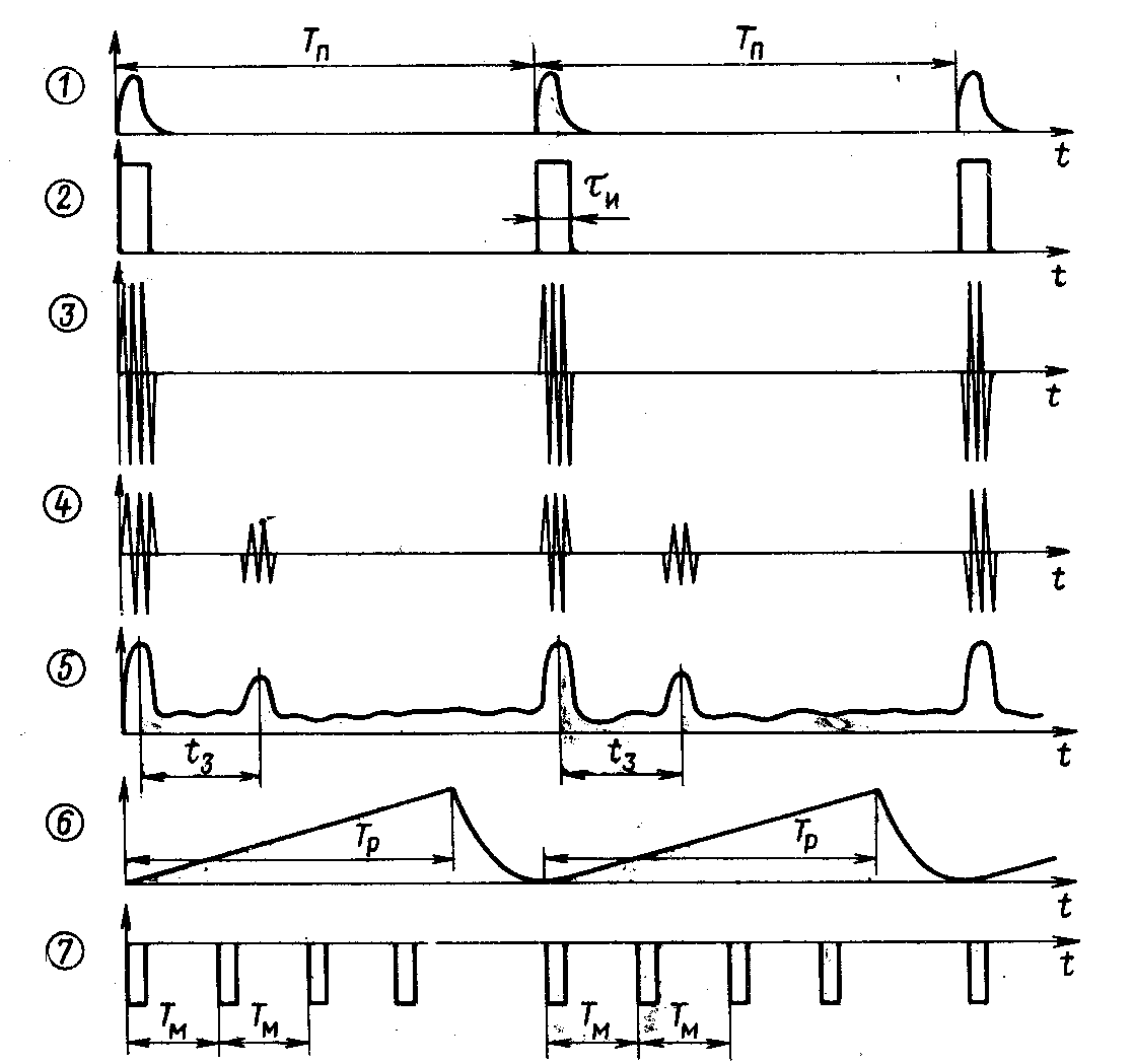 Модулятор приемопередатчика генерирует импульсы бланкирования и старт-импульс, синхронизирующие работу индикаторного и приемного каналов РЛС. Старт-импульс формируется в момент излучения СВЧ импульса в модуляторе и поступает на вход синхронизатора индикаторного блока. Синхронизатор вырабатывает ключевой импульс управления разверткой и импульс подсвета, начало которых совпадает с моментом прихода старт-импульса. Кроме того, синхронизатор формирует калибрационные метки дальности, первая из которых совпадает с моментом излучения, т. е. соответствует нулю дальности. Старт-импульс запускает также узел ВАРУ—РРУ приемного устройства.