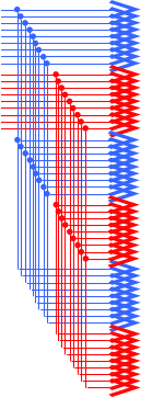 Рассмотрим также принцип коммутации разноименных временных каналов, он сводится к перестановке импульсов из одной временной позиции в другую (или в общем случае сдвигу). Технически эта перестановка осуществляется с помощью записи последовательности битов в оперативное запоминающее устройство (ОЗУ) подряд, а в следующем цикле считывании ее в порядке соответствующем требуемой коммутации. Запись информации производится последовательно (есть адреса, по которым производится запись, генерируются счетчиком тактовых импульсов), а чтение – выборочно (то есть в соответствии с адресами, считываемыми из управляющего запоминающего устройства (УЗУ)).