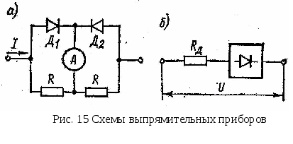 Для измерения тока и в цепях повышенной частоты широко применяют выпрямительные приборы, состоящие из выпрямительного преобразователя и магнитоэлектрического микро- или миллиамперметра (рис.14, а). В качестве выпрямительных элементов используются полупроводниковые (германиевые или кремниевые) диоды, выпрямляющее действие которых определяется коэффициентом выпрямления