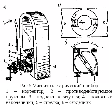 Под воздействием вращающего момента подвижная часть всегда будет поворачиваться до упора. Необходим противодействующий момент М>п> , направленный навстречу вращающему моменту. Противодействующий момент можно получить за счет механических или электрический сил. В первом случае он создается с помощью плоских спиральных пружин или металлических нитей, закрепленных концами на неподвижной и подвижной частях прибора и закручивающихся при повороте подвижной части. Механический противодействующий момент прямо пропорционален углу поворота а: