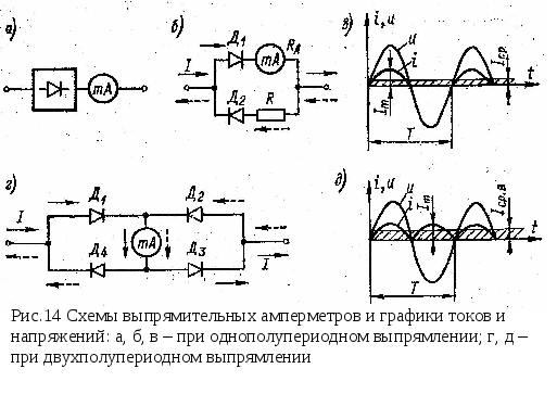 В схеме с двухполупериодного выпрямления (рис.14, г) измеряемый ток в течении положительного полупериода проходит по цепи Д>1> – миллиамперметр – Д>3> , а в течении отрицательного – Д>2> – миллиамперметр – Д>4>. Показания миллиамперметра пропорционально средневыпрямленному значению переменного тока. Для синусоидального тока (рис.14, д)