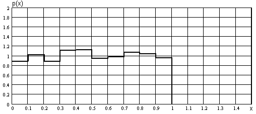 Количества выборок, попадающих в каждый из интервалов, частоты попадания, оценки плотности сведены в табл. 2.1. Гистограмма распределений представлена на рис. 2.2. Как видно, она достаточно хорошо совпадает с равномерным законом распределения (1.7).
