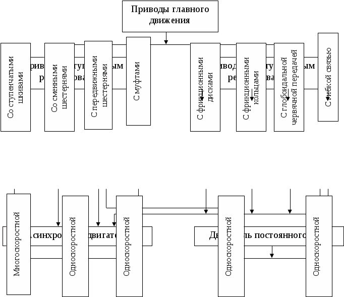 В главных приводах токарных станков широкого назначения малой и средней мощности основным типом привода является привод с асинхронным короткозамкнутым двигателем. Частота вращения шпинделя токарных станков регулируется путем переключения зубчатых передач коробки скоростей. В последнее время появляется все больше станков, в которых переключения производится дистанционно с помощью электромагнитных фрикционных муфт. Для пуска, останова и изменения направления вращения (реверсирования) в токарных станках малой и средней мощности часто применяют фрикционные муфты. Двигатель при этом все время включен и вращается в одном направлении. Движение подачи малых и средних токарных станков чаще всего осуществляется от главного привода. Регулирование подачи осуществляется аналогично с помощью коробки зубчатых передач, которая переключается вручную или дистанционно.