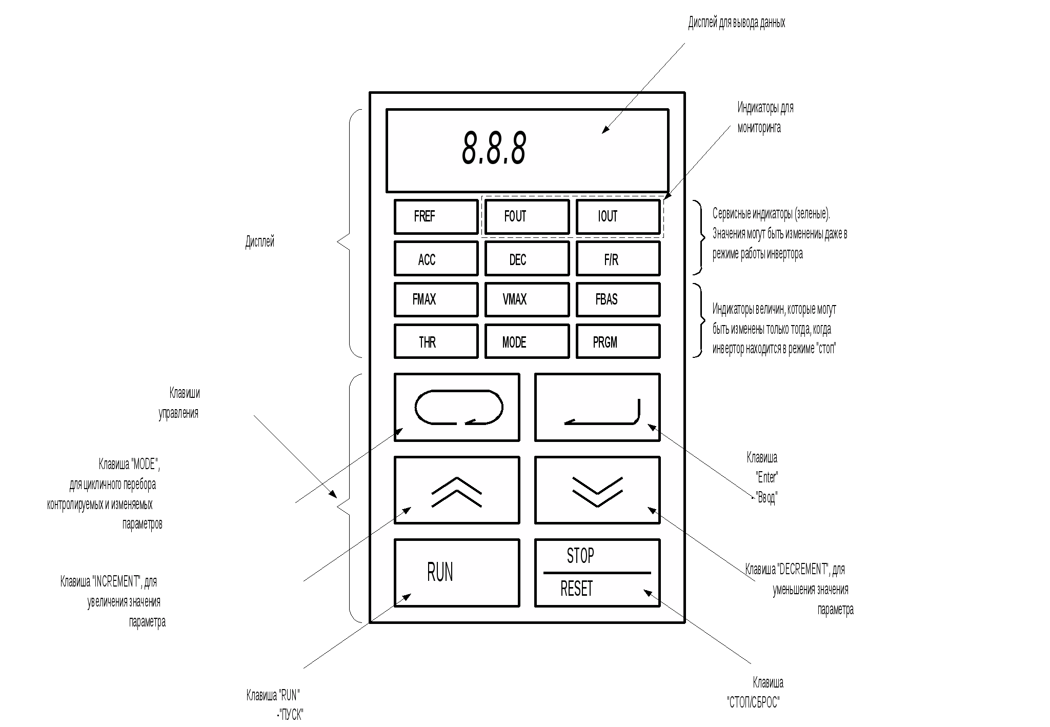 Управляющие входы инвертора подразделяются на дискретные и аналоговые. Задание направления вращения и команды “СТОП” и “ПУСК” подаются только с дискретных входов. Задание частоты вращения может происходить как в цифровой форме, так и в аналоговой. В данной схемной реализации применен аналоговый способ задания частоты (потенциальный) как более наглядный и простой. Он реализуется посредством потенциометра, с которого снимается сигнал 0-10 В и подаётся на вход “FR” (“FC” - общий).