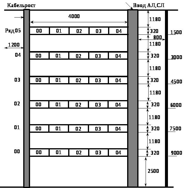 Высота ряда вместе с кабель ростом не более 2450 мм, ширина одного статива не более 800 мм, глубина не более 320 мм, шаг установки стативных рядов не менее 1280 мм (рис.7).