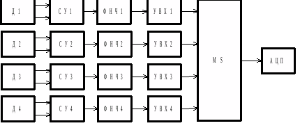 СУ1…4 – согласующие усилители, ФНЧ1…4 – фильтры нижних частот, УВХ1…4 – устройства выборки-хранения, MS – мультиплексор, АЦП – аналого-цифровой преобразователь.