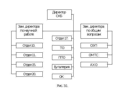 Расмотрим организационную структуру предприятия на примере СКБ «Молния» рис. 3.1. СКБ «Молния» состоит из совокупности функционально связанных отделов: отдел системных разработок, двух отделов схемных разработок ( один из которых занимается схемотехническими решением для аппаратуры систем связи), отдел конструирования РЭА, а также отдел опытного-эксперементального производства, техническийотдел (испытания выпускаемой продукции на надёжность и стойкость), отдел технической документации, служба нормоконтроля (проверка соответствия чертежей разрабатываемой продукции установленным ГОСТам), отдел стандартизации и метрологии (метрологическая экспертиза). Отдельной совокупностью выступают административно-управленческие отделы СКБ: бухгалтерия, отдел кадров, административно-правовой отдел.