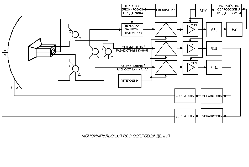 Суммарный сигнал, а также угломестный и азимутальный разностные сигналы преобразуются в сигналы ПЧ с помощью одного общего гетеродина для сохранения относительного соотношения фаз сигналов по ПЧ. Выходной суммарный сигнал ПЧ детектируется и используется в качестве входного видеосигнала схемы сопровождения по дальности. В схеме сопровождения по дальности определяется время прихода очередного эхо-сигнала от сопровождаемой цели и вырабатываются стробирующие импульсы, отпирающие соответствующие цепи приемника только на те короткие интервалы времени, когда ожидается эхо-сигнал выбранной цели. Стробированый видеосигнал используется также для формирования напряжения постоянного тока для схемы АРУ всех трех усилительных каналов ПЧ, в которых АРУ поддерживает постоянство угловой чувствительности (крутизны сигнала ошибки) схемы сопровождения по углам, даже если эхо-сигнал цели изменяется в широком динамическом диапазоне. Для получения устойчивого автоматического сопровождения по углам необходимо поддерживать с помощью АРУ постоянство усиления следящей системы схемы сопровождения.