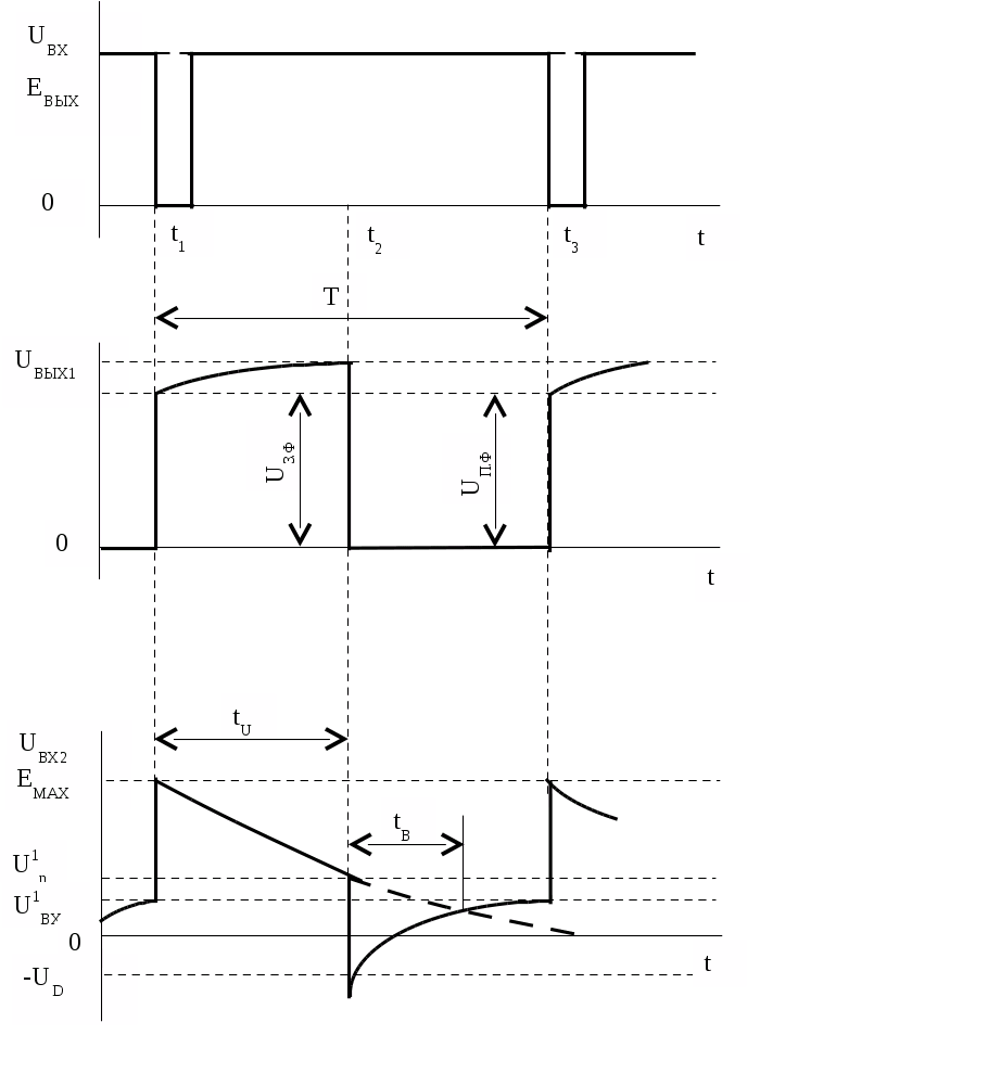 Напряжение U>ВХ2 >на выходе ИЛЭ ТТЛ DD1.2 экспотенциально изменяется от E>max>, стремясь к нулю . Формирование рабочего импульса > >длительностю t>U >заканчивается при U>ВХ2>(t>U>) = U1>n> , так как дальнейшее уменшение входного напряжения приводит к увеличению выходного напряжения ИЛЭ ТТЛ DD1.2.