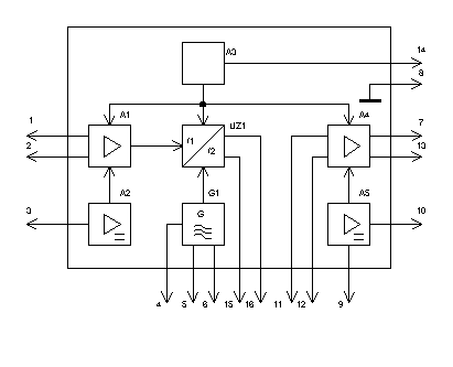 Рисунок 2.2 Функциональная схема ИМС К174ХА2 Примечание к рисунку: А1- усилитель радиочастоты (УРЧ); А2- система АРУ; А3- стабилизатор напряжения; А4- усилитель промежуточной частоты (УПЧ); А5- система АРУ; G1-гетеродин; UZ1- смеситель. |