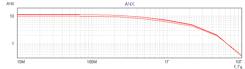при R11 = 6,2 кОм , полоса пропускания f – 594,4 МГц усиление равно 8,55.