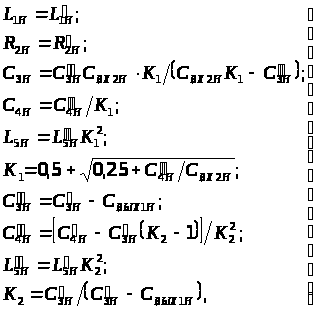 Для расчета нормированных значений элементов L>1>, R>2>, C>3>, C>4>, L>5>, обеспечивающих заданную форму АЧХ с учетом реальных нормированных значений С>ВЫХ1> и С>ВХ2>, следует воспользоваться формулами пересчета [14]: