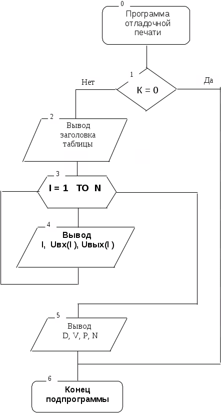 На этом этапе отладки дополнительно вводится таблица значений элементов массивов Uвх(t), Uвых(t), D, V, P, N. Схема алгоритма приведена на рисунке 6. Подпрограмма имеет вид: