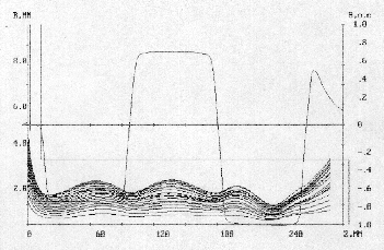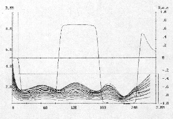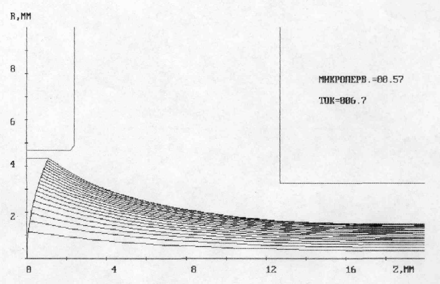 Далее эта электронная пушка была поставлена в систему, и был выполнен новый расчет ЭОС от катода до конца пролетного канала. Результаты расчета показаны вверху на плакате 4 (рис.2.5). Сравнивая эти данные (рис.2.5) с результатами расчета на рис.2.2 можно сделать вывод о том, что применение новой электронной пушки улучшило ламинарность электронных траекторий. Теперь крайняя траектория не пересекает остальные траектории пучка. Однако радиус электронного потока в выходной части прибора уменьшился лишь на 7 %.