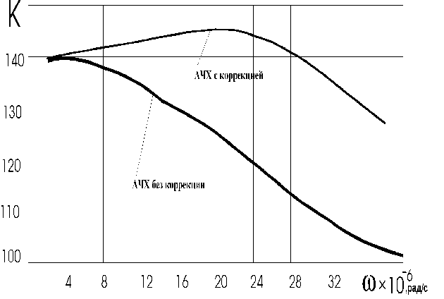 Рис 3. АЧХ каскада с коррекцией и без коррекции в диапазоне 105 ... 2 · 106 рад/с.