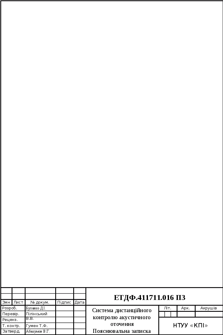Представлений на рецензію дипломний проект студента Булавка Дмитра Ігоровича. на тему «Система дистанційного контролю акустичного оточення» складається з пояснювальної записки 84 сторінок формату А4 та 6 креслень формату А1. та є конструкторською документацією на розроблений прилад, що здійснює спектральний аналіз рівня звукового тиску з частотною корекцією та без неї.