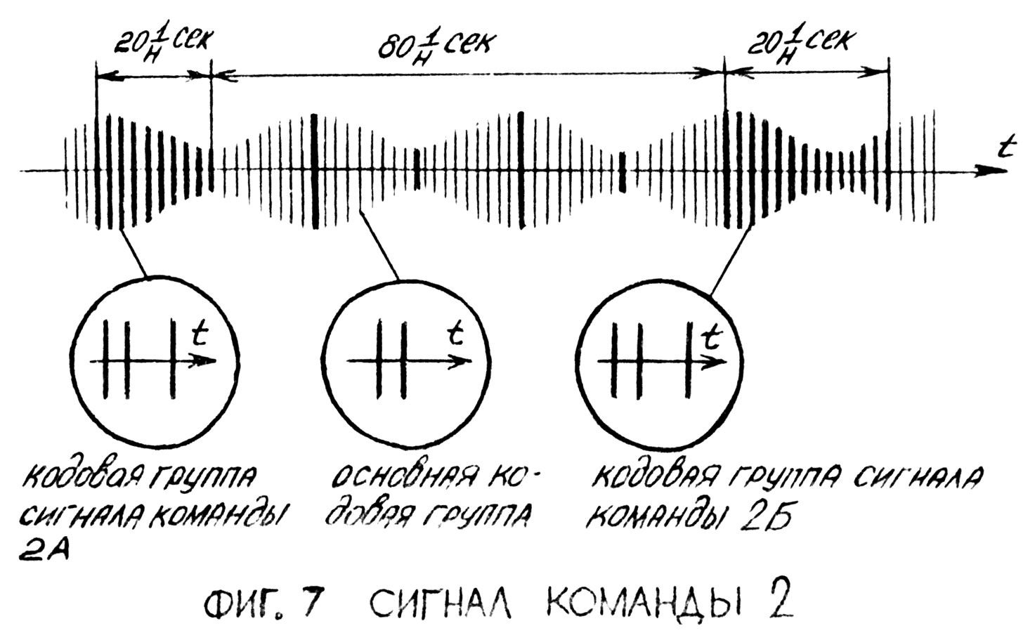 Предварительная команда 2А и исполнительная команда 2Б передаются с помощью двух серий импульсов по 20 трех импульсных кодовых групп в каждой. Серия импульсов, соответствующая команде 2Б. Передается через 80 периодов частоты Н Гц после окончания передачи команды 2А (фиг. 7).