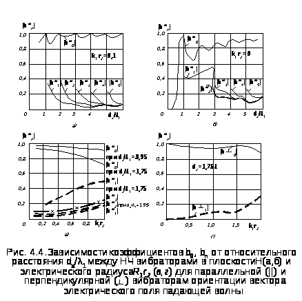 Анализ рис. 4.4 показывает, что с увеличением расстояния d>x>/>1> между соседними вибраторами в НЧ ФАР по сравнению с длиной волны ВЧ ФАР, что эквивалентно увеличению отношения рабочих часто f>1>/f>2>, уровень дополнительных боковых лепестков и снижение КУ уменьшаются, а с увеличением электрической толщины вибраторов k>1>r>2> - увеличиваются. Кроме того, искажения, вносимые излучателями НЧ ФАР в поле ВЧ ФАР, гораздо меньше при взаимно ортогональной линейной поляризации излучателей ВЧ и НЧ ФАР. Следует отметить, что (4.1), (4.3) - (4.5) не учитывают влияния системы питания и крепления НЧ вибраторов на рассеяние поля ВЧ ФАР. Последнее особенно заметно проявляется при взаимно ортогональной поляризации в диапазонах f>1> и f>2>. При этом (4.1), (4.3) - (4.5) могут давать несколько заниженные оценки искажений в ВЧ диапазоне.