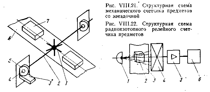 По аналогичной схеме работают радиоизотопные и рентгеновские счетчики, основанные на поглощении ионизирующего или рентгеновского излучения предметом, проходящим между источником и приемником излучения. Радиоизотопный релейный счетчик (рис. VIII.22)-предназначен для учета различных по форме и габаритам предметов 2, движущихся по конвейеру или другому транспортирующему устройству 3. При этом ионизирующее -излучение от источника / поглощается или ослабляется, что воспринимается приемником излучения 4. Этот сигнал с помощью релейного блока 5 преобразуется в единичные электрические импульсы, которые отсчитываются и суммируются быстродействующим импульсным счетчиком 6.