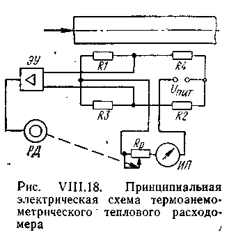 Чувствительными элементами термоанемометрического тепло-sore расходомера опары и теста (рис. VIII.18). являются резисторы R1 и R2, помещаемые (наматываемые) на стенке трубопровода на некотором расстоянии друг от друга. Манганиновые резисторы R3 н R4 служат для создания мостовой схемы, питаемой от источника напряжения Uпит. Сигнал разбаланса, пропорциональный изменению расхода, подается на электронный усилитель ЭУ, где усиливается и после этого управляет вращением реверсивного электродвигателя РД, который, производя перестановку .движка компенсирующего переменного резистора R>r>, изменяет напряжение питания до тех пор, пока разбаланс в измерительной диагонали моста не станет равным заданному. Мерой расхода могут служить показания амперметра, ваттметра (на схеме не показан) или положение движка R>p>.
