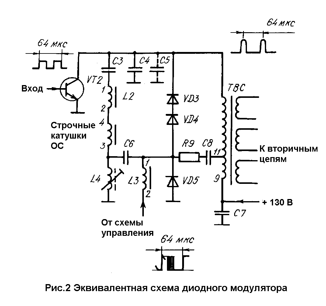 Во время обратного хода строчной развертки положительный импульс в коллекторной цепи транзистора VТ2 закрывает диоды VD3 — VD5. Под влиянием импульсов обратного хода, поступающих с вывода 11 обмотки трансформатора Т2, в контуре С8L4 возникают