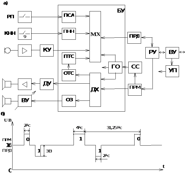 Рис. 1. а) Структурная схема цифрового телефонного аппарата , б) Временные диаграммы , поясняющие работу ЦТА .