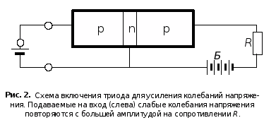 При увеличении прямого напряжения на левом переходе увеличивается ток через правый переход и растёт напряжение на сопротивлении нагрузки R. Когда ле-вый p—n-переход открыт, ток через правый n—p-переход делается настолько боль-шим, что значительная часть напряжения батареи Б падает на сопротивлении на-грузки R.