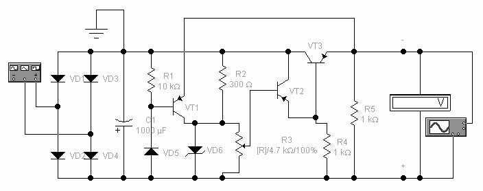 Силовой трансформатор – преобразует переменное напряжение одной величины в переменное напряжение другой величены. На схеме заменен на генератор синусоидального напряжения 20В, с частотой 50Гц.