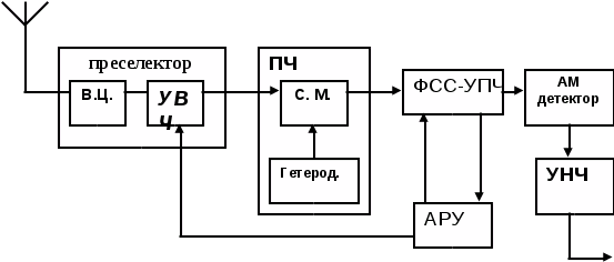 Сигнал от приемной антенны поступает на вход приемника и, в первую очередь подается на блок преселектора. В преселекторе осуществляется выделение спектра полезного высокочастотного сигнала от определенного источника, выбор которого производится с помощью элементов перестройки контуров преселектора. В преселекторе осуществляется также предварительное усиление сигнала Необходимо отметить, что от построения блока преселектора зависят такие качественные показатели приемника как избирательность по зеркальному и сквозному каналам приема и чувствительность. Избирательность обеспечивается за счет амплитудно-частотной характеристики (АЧХ) входной цепи (ВЦ) и резонансных контуров усилителя высокой частоты (УВЧ). Чувствительность приемника обеспечивается применением в УВЧ активных малошумящих элементов в сочетании с максимально возможным коэффициентом передачи входной цепи в полосе пропускания. Структура приемника приведена на рис. 1.