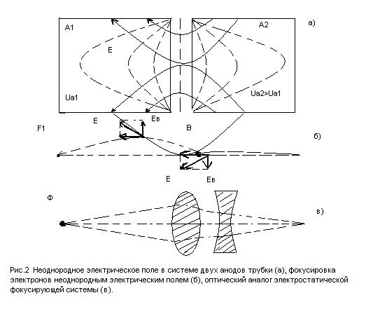 На рисунке 2б), выделена лишь одна электрическая силовая линия и показана траектория электрона, отклоняющегося от оси под небольшим углом и встречающегося с силовой линией в точке А. В этой точке вектор напряженности электрического поля Е можно разложить на горизонтальную Ег и вертикальную Ев составляющие. Согласно соотношению Ег будет ускорять электрон в сторону экрана, а Ев будет прижимать его к оси, то есть осуществлять фокусировку.