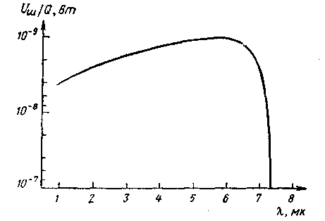 Чувствительность прибора в различных частях спектра описывается спектральной характеристикой. Спектральная чувствительность детектора из InSb иллюстрируется рис. 4. Длинноволновая граница характеристики равна 7,4 мк. При длинах воли выше этой величины энергии фотона слишком мала для генерации неосновных носителей. При меньших длинах волн чувствительность быстро растет, пока коэффициент поглощения не станет значительно меньше обратной толщины пластинки. Максимальная чувствительность прибора достигается при длине волны порядка 6 мкм.