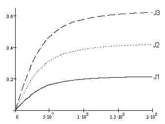 Рис. 2. Семейство зависимостей тока короткого замыкания ФМЭ от магнитного поля при малой скорости поверхностной рекомбинации при различной интенсивности света J, фотонов/м2∙с: J>1> = 1017, J>2> = 2∙1017,