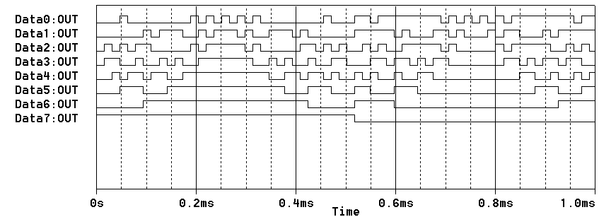 На рис. 11 приведён график сигналов выбора адреса, появляющихся на выходах счётчика при частоте формируемого синуса 1кГц.