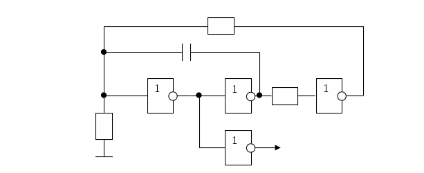 На рис. 5 изображена упрощенная схема R-C генератора на основе логических инвертирующих элементах. Эта схема используется в неответственных частях устройства, т. к. она обладает простотой реализации, дешевизной деталей и не требует настройки, Но её основным недостатком является временная нестабильность и частота генератора будет изменяться от модуля к модулю из-за разброса параметров компонентов .