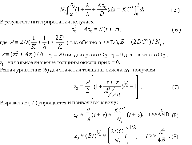 Ñêîðîñòü ðîñòà îêèñëà îïðåäåëÿåòñÿ ïîòîêîì (F3) è êîëè÷åñòâîì ìîëåêóë îêèñëèòåëÿ (Ni), íåîáõîäèìûì äëÿ îáðàçîâàíèÿ îêèñëà â åäèíè÷íîì îáúåìå. Ïîñêîëüêó êîíöåíòðàöèÿ ìîëåêóë SiO>2> â îêèñëå ðàâíà 2,2*1022 ñì-3, òî äëÿ ïîëó÷åíèÿ äâóîêèñè êðåìíèÿ òðåáóåòñÿ êîíöåíòðàöèÿ ìîëåêóë êèñëîðîäà ðàâíàÿ 2,2*1022 ñì-3 èëè êîíöåíòðàöèÿ ìîëåêóë âîäû 4,4*1022 ñì-3.