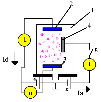 При этом в объеме 1 создается пониженное давление кислорода (обычно 0.1--1 Торр) и между электродами 2 и 3 прикладывается постоянное напряжение разряда Ud величиной внесколько сотен вольт.