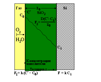 Методом радиоактивного маркера показано, что рост SiO>2> происходит за счет диффузии кислорода к поверхности кремния. Выход SiO>2> за границы начального объема, занимаемого кремнием, обусловлен их разными плотностями. Физика термического окисления может быть объяснена с помощью достаточно простой модели Дила-Гроува, поясняемой с помощью рис. 2.