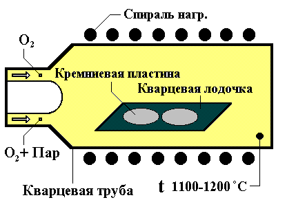 Слой двуокиси кремния формируется обычно на кремниевой пластине за счет химического взаимодействия в приповерхностной области полупроводника атомов кремния и кислорода. Кислород содержится в окислительной среде, с которой контактирует поверхность кремниевой подложки, нагретой в печи до температуры T = 900 - 1200 С. Окислительной средой может быть сухой или влажный кислород. Схематично