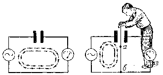 Поместим теперь между пластинами конденсатора еще одну пластину и присоединим ее к нашей схеме в точке б. Когда это мы сделаем, то заметим, что стрелка прибора установилась на нуле: тока в цепи прибора не стало.