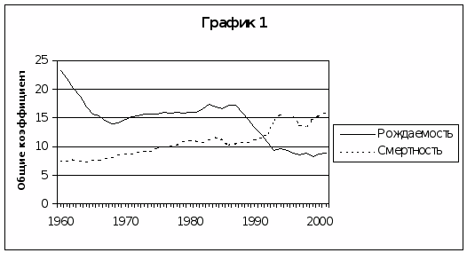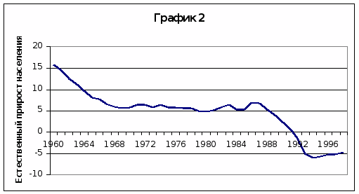 В девяностые годы кризис принял характер катастрофы – в 1992 году смертность превысила рождаемость, и коэффициент естественного прироста стал отрицательным – началась депопуляция (график 2, таблица 1 в приложении).