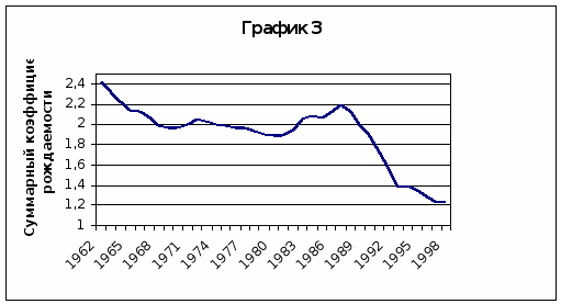 Если рассматривать динамику более точных суммарных коэффициентов (график 3, таблица 2) то видно, что рождаемость начала резко падать в 1987 году. Снижение в период 1962-1972 составило 15,1% а в период 1988-1998 - 41,7%