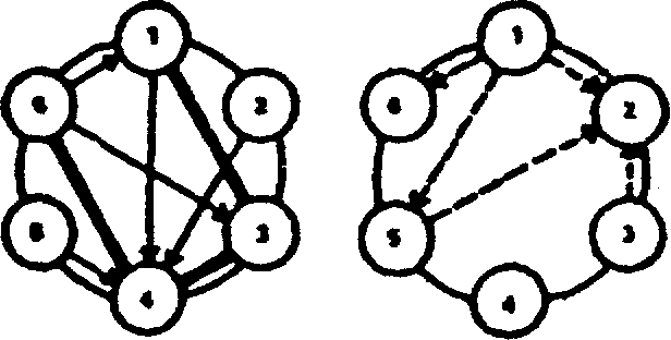 При непараметрическом выборе даже в случае относительно небольших групп возникает значительное количество различного вица связей между членами группы, значит, и графическое представление социограмм становится усложненным. Поэтому для проведения анализа следует всегда изыскивать пути упрощения социометрического чертежа. Так, социоматрица, представленная в табл. 2, легко прочитывается, если отдельно представить "положительные" связи и "отрицательные" (см. рис.}.